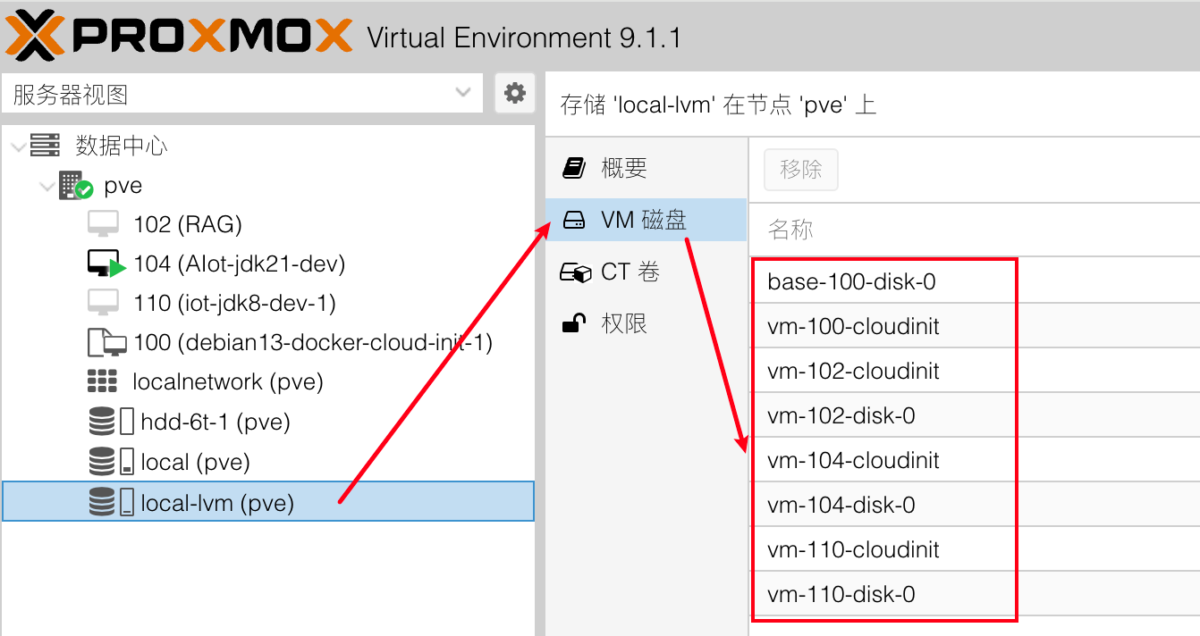 - –storage local-lvm:明确指定放到现在的 LVM-Thin(data)上,视情况更改