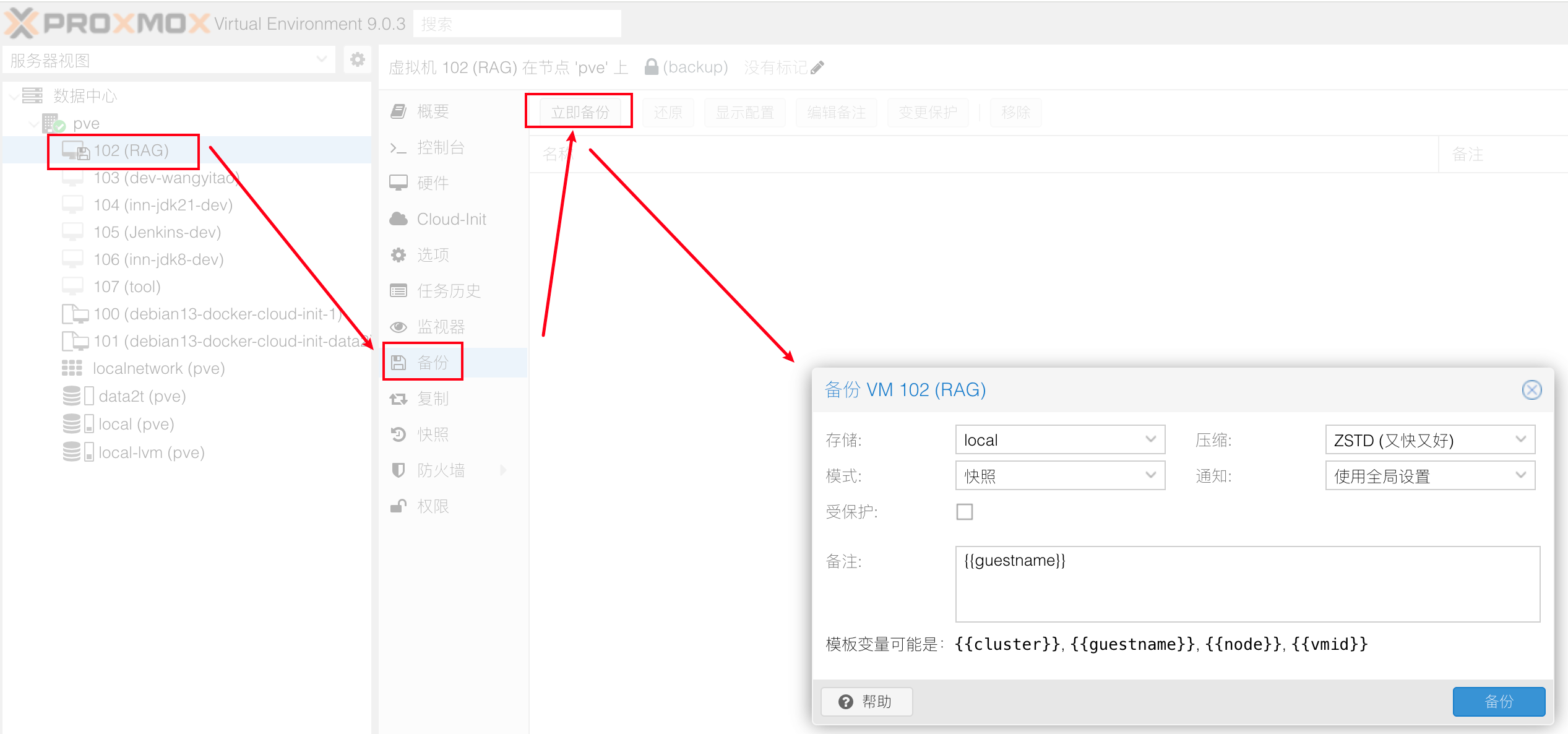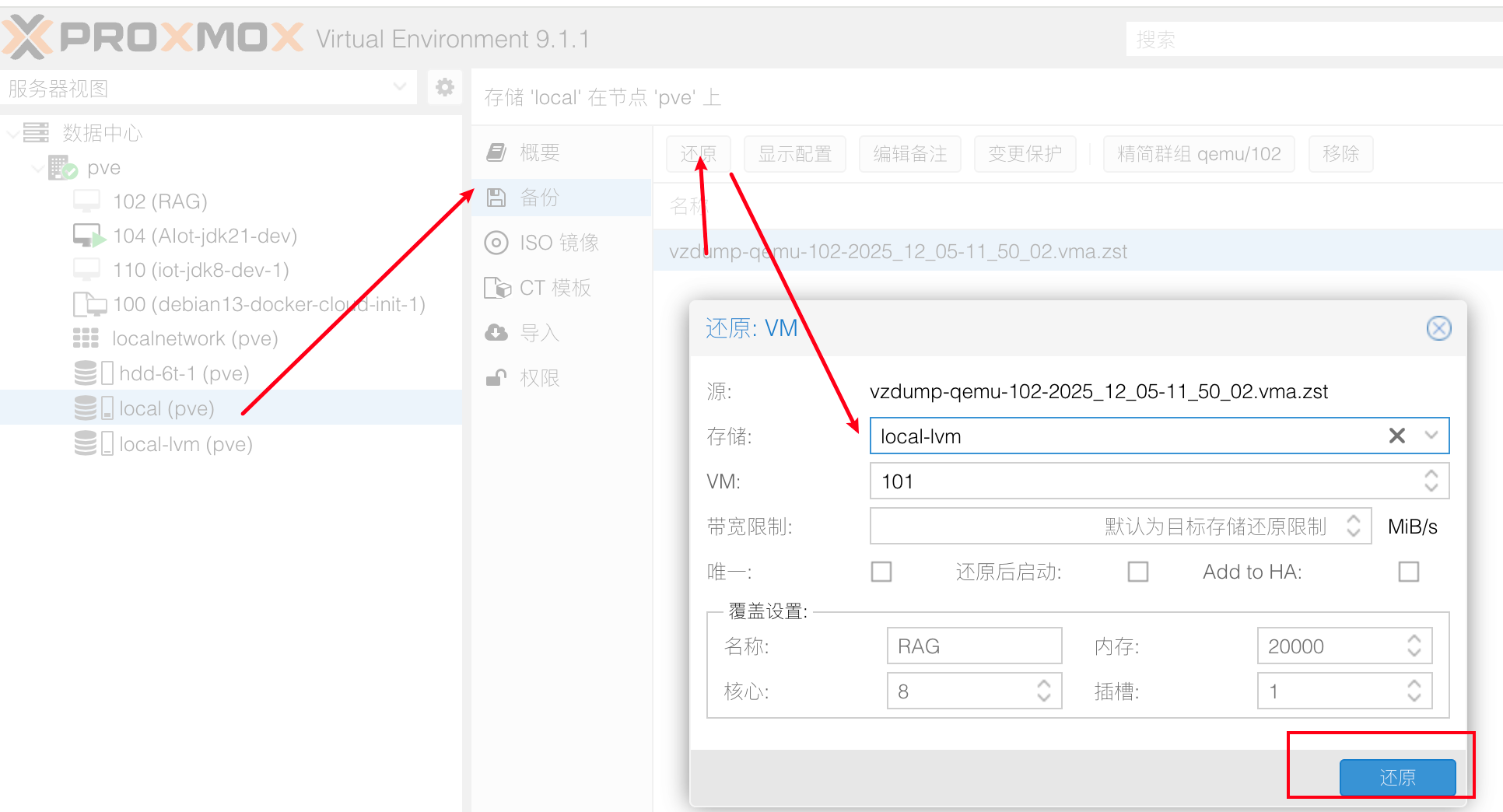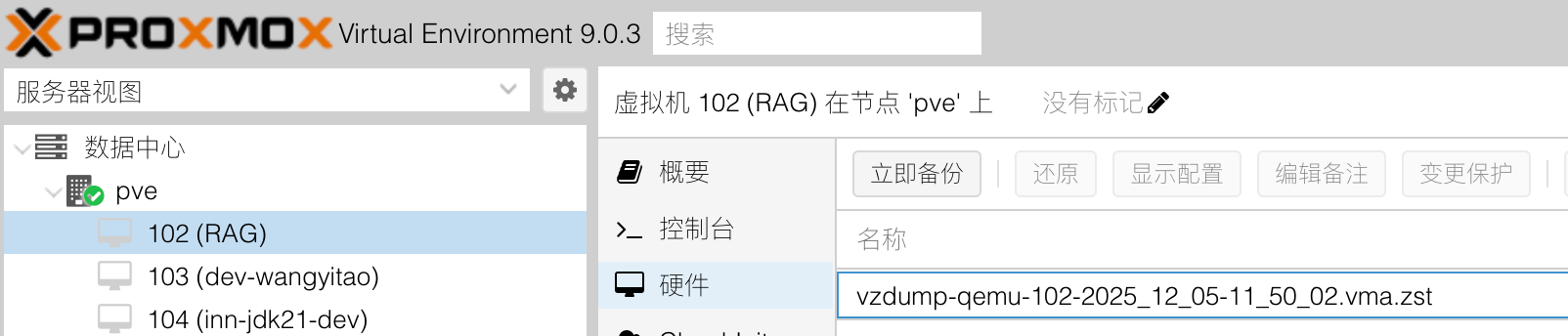 备份文件为 vzdump-qemu-102-2025_12_05-11_50_02.vma.zst